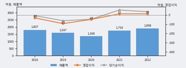 최근 실적을 살펴보면 2022년 매출액이 최근 5년 중 가장 높은 실적을 기록했음을 알 수 있다. 이전 최고 실적이었던 2018년 보다도 5.0%(90억 7천만원) 늘어난 것으로 나타났다.