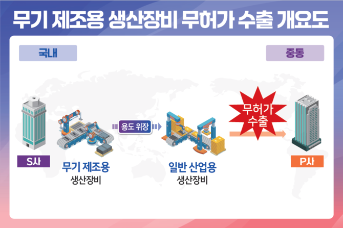 ▲총기 부품 및 부속품을 무기와 전혀 관련이 없는 기계 공구의 부분품 또는 일반 철강 제품으로 품명을 위장하여 밀수출하거나 ▲무기 생산장비를 방위사업청장의 허가가 필요 없는 일반 산업용 생산장비인 것처럼 신고하여 불법 수출했다.