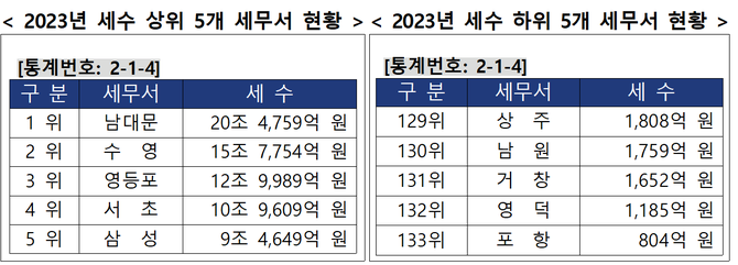 영등포세무서는 부진했다. 영등포세무서는 금융사 실적에 의존하는 데 금융사들이 지난해 고전을 겪으면서 세수도 2022년 15.1조원에서 2023년 13.0조원으로 실적이 줄었다.