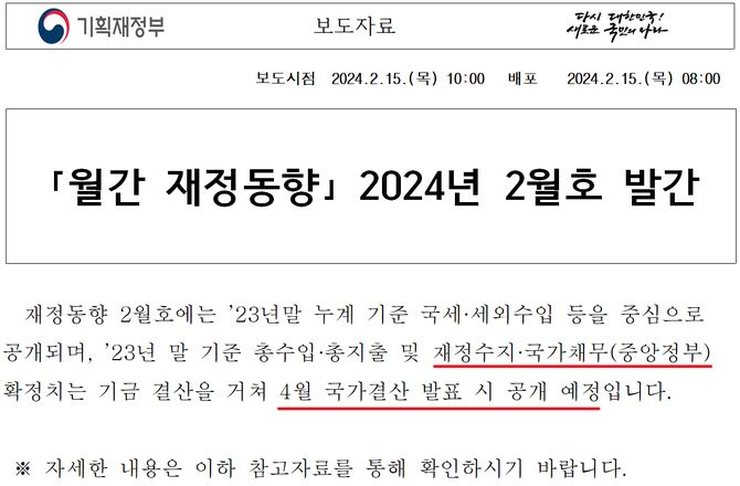 보통 1년 치 재정수지는 2월 중하순~3월 초 발표되는 월간 재정동향 2월호에 담긴다.