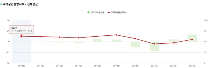 전국의 주택구입물량지수는 2012년 최초 통계 작성 당시 64.8을 기록한 뒤 추세적으로 하락해 2021년 44.6까지 떨어졌다가 2년 연속 반등했다.