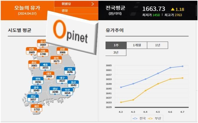 6일 한국석유공사 유가정보시스템 오피넷에 따르면 4월 첫째 주(3월 31일∼4월 4일) 전국 주유소 휘발유 평균 판매가는 L당 1천647.0원으로 직전 주 대비 7.5원 상승했다.