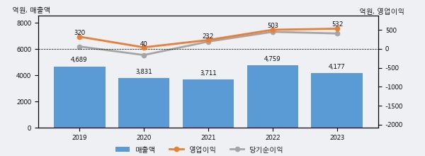 백산의 2023년 매출액은 4177억으로 전년대비 -12.2% 하락했고, 영업이익은 532억으로 전년대비 5.7% 상승했다. 이 회사의 매출액 증감률과 영업이익 증감률은 각각 코스피 하위 22%, 상위 47%에 해당된다.