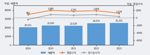 최근 실적을 살펴보면 2023년 매출액이 최근 5년 중 가장 높은 실적을 기록했음을 알 수 있다. 이전 최고 실적이었던 2022년 보다도 0.9%(226억 3천만원) 늘어난 것으로 나타났다.