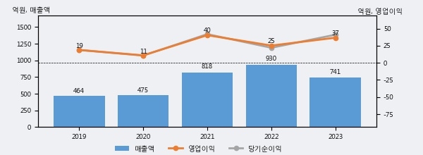 빛샘전자의 2023년 매출액은 전년대비 -20.3% 줄어든 741억원이고, 영업이익은 전년대비 45.6% 늘어난 37억원을 기록했다. 이 회사의 매출액 증감률과 영업이익 증감률은 각각 코스닥 하위 21%, 상위 22%에 해당된다.