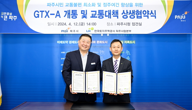 (조세금융신문=구재회 기자) 경기 파주시와 한국토지주택공사(LH) 파주 사업본부는 12일 '수도권 광역급행철도(GTX)-A 개통 및 운정3지구 교통 대책 마련을 위한 상생 협약'을 체결했다고 밝혔다.