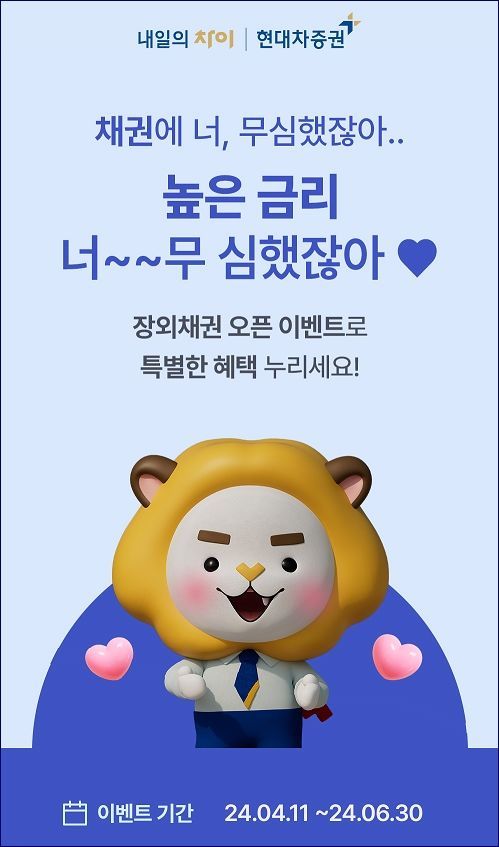 또 장외채권 선착순 매수 이벤트도 함께 진행 중이다. 이벤트 신청 후 현대차증권 MTS 내일을 통해 이벤트 기간 내 장외채권을 최소 100만원 이상 매수하면 선착순 1000명에게 스타벅스 커피 쿠폰을 준다고 현대차증권은 전했다.