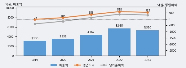 모트렉스는 2023년 매출액 5310억원과 영업이익 532억원을 기록했다. 전년대비 매출은 -6.6%, 영업이익은 -9.6% 각각 하락했다. 이 회사의 매출액 증감률과 영업이익 증감률은 각각 코스닥 하위 39%, 상위 46%에 해당된다.