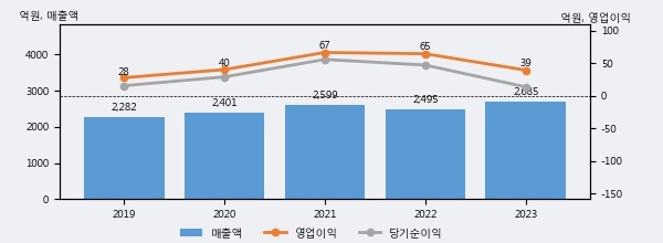 최근 실적을 살펴보면 2023년 매출액이 최근 5년 중 가장 높은 실적을 기록했음을 알 수 있다. 이전 최고 실적이었던 2021년 보다도 3.3%(85억 6천만원) 늘어난 것으로 나타났다.