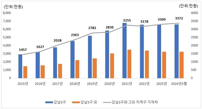 16일 우리은행 자산관리컨설팅센터 조사에 따르면 2022년 3.3㎡당 3178만원으로 좁혀졌던 강남3구와 그 외 서울지역 아파트의 매매가격 차이가 최근 다시 벌어지고 있다. 이 차이는 2023년 3309만원에서 2024년 3월 현재 3372만원으로 확대됐다. 2022년(3178만원) 대비 약 194만원 더 벌어진 것.