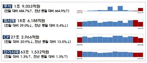 기업어음(CP)·단기사채 발행 실적은 같은 기간 96조8천867억원에서 90조4천498억원으로 6조4천369억원(6.6%) 감소했다.