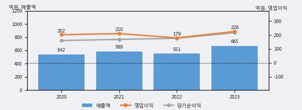 최근 실적을 살펴보면 2023년 매출액이 최근 4년 중 가장 높은 실적을 기록했음을 알 수 있다. 이전 최고 실적이었던 2021년 보다도 13.1%(77억 1천만원) 늘어난 것으로 나타났다.