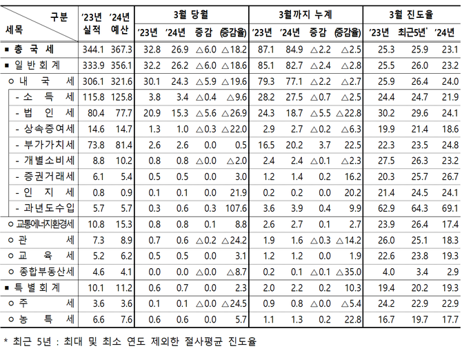 2024년 3월 누적 총국세 세수진도율은 23.1%다. 이는 최근 5년 사이 최하이지만, 성격으로는 최악이다.