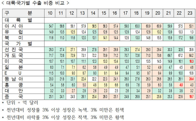 2023년도 수출 비중을 보면 중국과 동남아는 각각 전년대비 –3.1%, -1.7% 줄었고, 미국은 2.4%가 늘었다. 선진국 개도국으로 나눠보면 선진국은 3.0% 늘었고, 개도국은 –3.0% 줄었다. 그래도 수출 비중은 선진국 35.8%, 개도국 64.2%다.