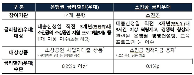 금감원은 "경영 컨설팅 등 소상공인 지원 프로그램을 활성화하고, 소상공인의 대출금리 부담 완화에 도움이 될 수 있도록 은행권과 소진공이 뜻을 모아 대출금리 할인 혜택을 상호 적용하기로 했다"고 설명했다.