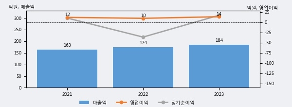 최근 실적을 살펴보면 2023년 매출액이 최근 3년 중 가장 높은 실적을 기록했음을 알 수 있다. 이전 최고 실적이었던 2022년 보다도 5.8%(10억 1천만원) 늘어난 것으로 나타났다.