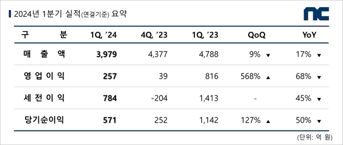 엔씨소프트는 1분기 연결 기준 매출 3979억원, 영업이익 257억원을 기록했다고 10일 밝혔다. 전년 동기 대비 매출은 16.9% 감소했고 영업이익도 68.5%나 줄었다.