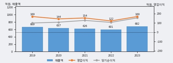최근 실적을 살펴보면 2023년 매출액이 최근 5년 중 가장 높은 실적을 기록했음을 알 수 있다. 이전 최고 실적이었던 2019년 보다도 2.1%(13억 8천만원) 늘어난 것으로 나타났다.