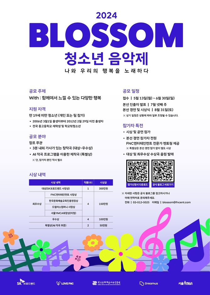 ‘2024 블러썸 청소년 음악제’는 청소년들이 행복을 주제로 자신들의 이야기를 담아 직접 작곡하거나 편곡한 음악을 공모한다.