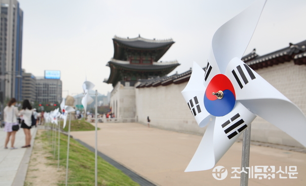 (조세금융신문=전한성 사진기자) 제70주년 광복절인 15일 오후 서울 종로구 광화문앞에 태극기가 그려진 바람개비가 바람에 날리고 있다.