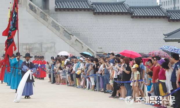 (조세금융신문=전한성 기자) 15일 오후, 제70주년 광복절을 맞아 서울 종로구 경복궁이 시민들에게 무료로 개방한 가운데 수문장 교대식을 보기 위해 많은 시민들로 붐비고 있다.
