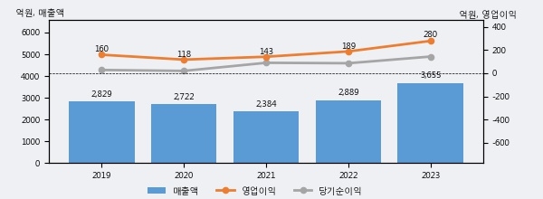 최근 실적을 살펴보면 2023년 매출액이 최근 5년 중 가장 높은 실적을 기록했음을 알 수 있다. 이전 최고 실적이었던 2022년 보다도 26.5%(766억 1천만원) 늘어난 것으로 나타났다.
