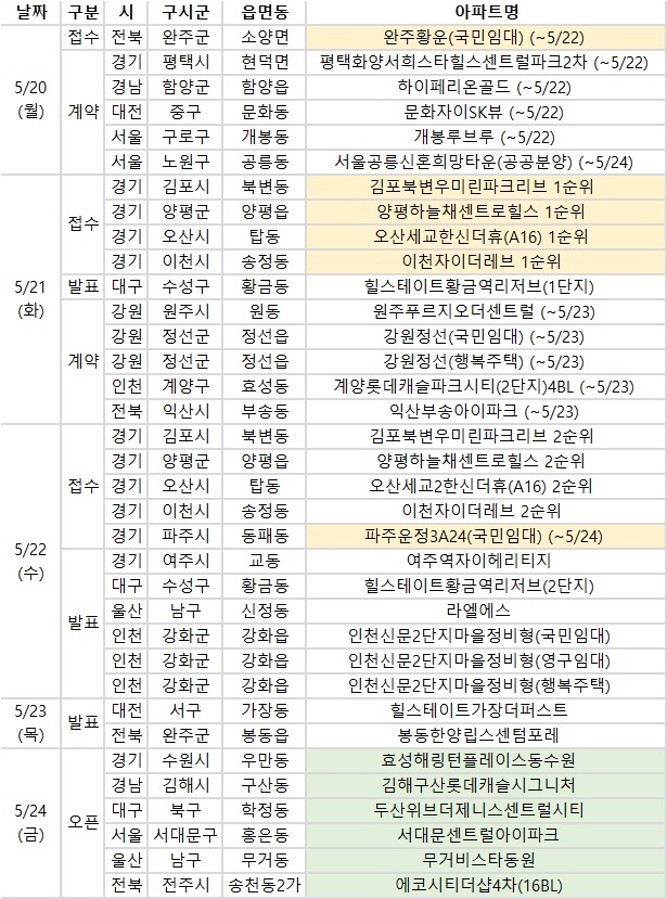 17일 부동산R114에 따르면 5월 넷째 주에는 전국 6개 단지, 총 4104가구(일반분양 2,510가구)가 분양을 시작한다.