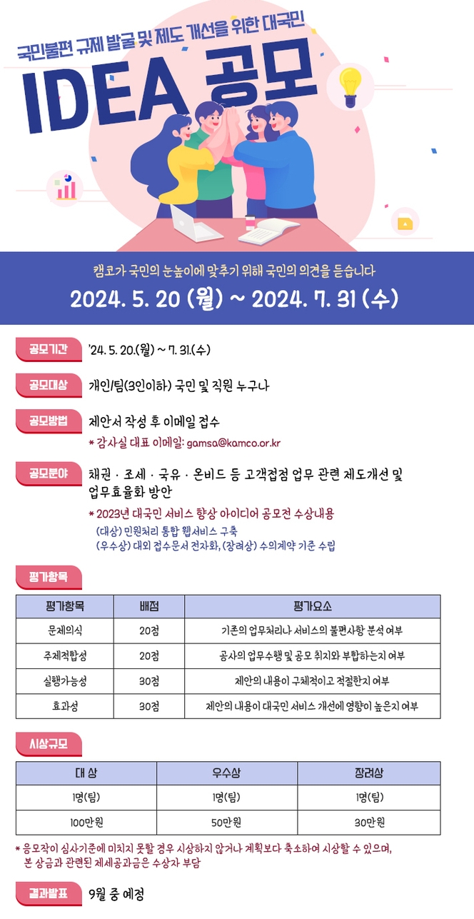 공모주제는 캠코 업무 중 채권‧조세‧국유 등 국민과의 접점이 많은 업무와 관련된 제도 개선 및 업무효율화 방안이다. 대한민국 국민이라면 누구나 개인 또는 3명 이내 팀을 이뤄 참가할 수 있으며, 응모는 캠코 감사실 이메일(gamsa@kamco.or.kr)로 접수하면 된다.