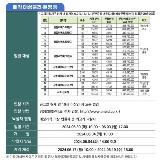 분양 예정 가격은 각 8억6천736만원, 11억3천256만원이다. 입찰은 오는 30일 오전 10시부터 6월 3일 오후 5시까지 전자자산처분시스템 '온비드'로 진행한다.