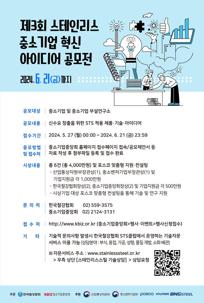 (조세금융신문=구재회 기자) 중소기업중앙회는 한국철강협회와 '제3회 스테인리스 중소기업 혁신 아이디어 공모전'을 개최한다고 26일 밝혔다.