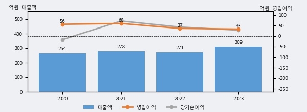 최근 실적을 살펴보면 2023년 매출액이 최근 4년 중 가장 높은 실적을 기록했음을 알 수 있다. 이전 최고 실적이었던 2021년 보다도 11.2%(31억원) 늘어난 것으로 나타났다.