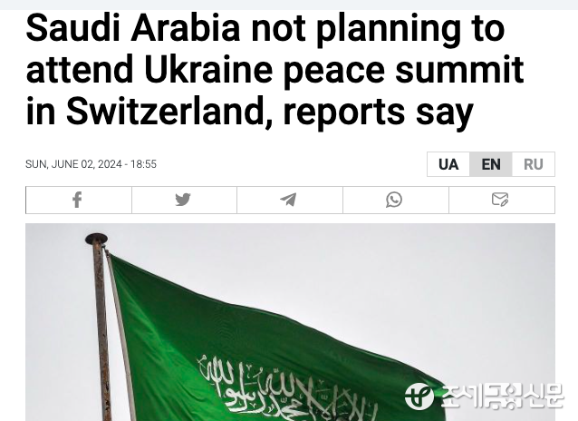 독일 통신사 <DPA>는 2일(현지시간) “사우디아라비아가 이달 중순 스위스에서 열리는 ‘우크라이나 평화회의’에 불참할 것”이라고 보도했다. 보도에 따르면, 이날 현재까지 사우디는 공식 불참선언은 하지 않았다.