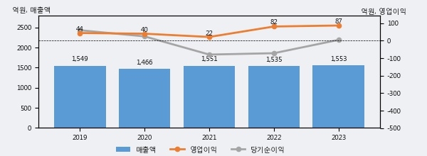 최근 실적을 살펴보면 2023년 매출액이 최근 5년 중 가장 높은 실적을 기록했음을 알 수 있다. 이전 최고 실적이었던 2021년 보다도 0.2%(2억 5천만원) 늘어난 것으로 나타났다.