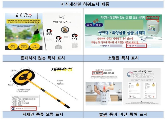 소멸한 권리를 유효한 권리 상태로 표시한 경우 246건, 출원한 사실이 없는데 출원 중인 것으로 표시한 경우 59건, 지식재산권 종류나 번호를 잘못 표시한 경우 52건, 존재하지 않거나 제품에 적용되지 않는 권리를 표시한 경우 10건 등이다.