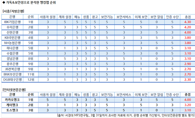 우리는 이제 어떤 은행을 이용할지 손가락으로 선택만 하면 된다. 시중은행, 지방은행, 인터넷 전문은행 모두 애플리케이션을 통해 이용가능하다. 하지만 이들 은행 중 어떤 앱이 더 보기 편하고 안전할지는 모든 은행의 앱을 이용하지 않는 이상 알 수 없다. 서경대학교 MFS팀이 이러한 궁금증을 해결하기 위해 15개의 은행 앱끼리 가독성, 보안성을 비교해 평가를 진행했다.