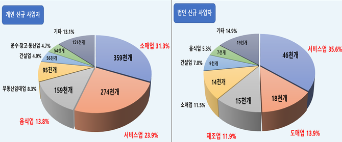 개인사업자는 부동산임대업(160.3만개, 23.2%), 소매업(110.1만개, 15.9%)이 가장 많았으며, 법인사업자는 서비스업(27.6만개, 24.8%), 제조업(20.8만개, 18.8%) 순이었다.