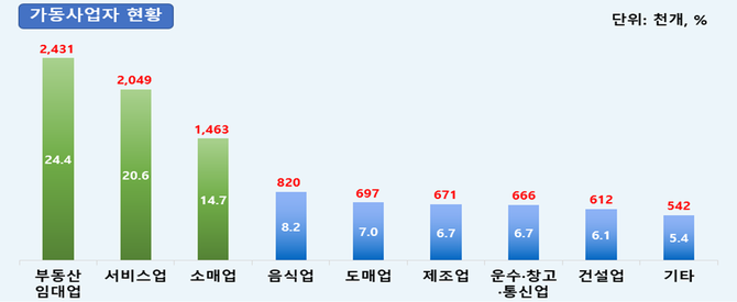 업종별로는 부동산임대업이 243.1만개(24.4%)로 가장 많았다.