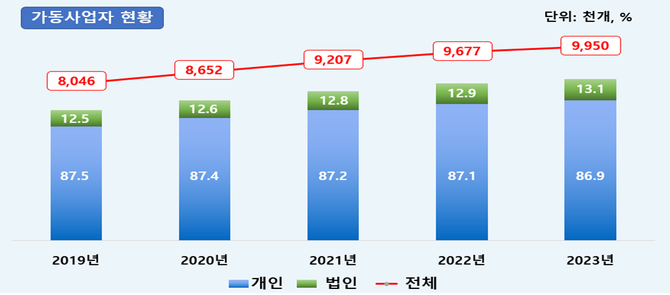 (조세금융신문=고승주 기자) 지난해 말 기준 가동사업자가 전년대비 2.8%(27.3만개) 증가한 995만개로 집계됐다.