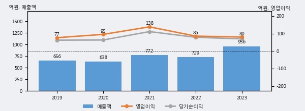 최근 실적을 살펴보면 2023년 매출액이 최근 5년 중 가장 높은 실적을 기록했음을 알 수 있다. 이전 최고 실적이었던 2021년 보다도 23.9%(184억 7천만원) 늘어난 것으로 나타났다.