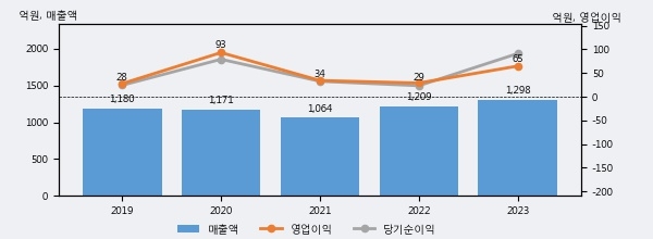 최근 실적을 살펴보면 2023년 매출액이 최근 5년 중 가장 높은 실적을 기록했음을 알 수 있다. 이전 최고 실적이었던 2022년 보다도 7.4%(88억 9천만원) 늘어난 것으로 나타났다.