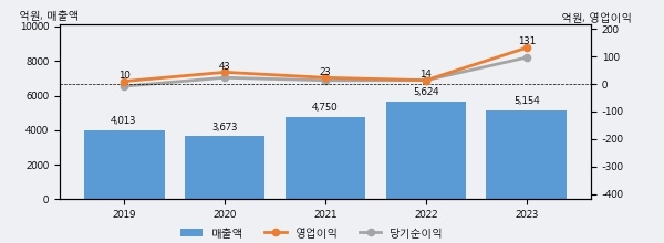 대원전선의 2023년 매출액은 전년대비 -8.4% 줄어든 5154억원이고, 영업이익은 전년대비 872.6% 늘어난 131억원을 기록했다. 이 회사의 매출액 증감률과 영업이익 증감률은 각각 코스피 하위 28%, 상위 2%에 해당된다.