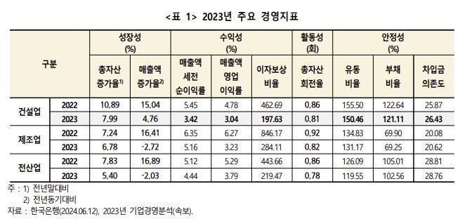 건설업 유동비율(유동자산/유동부채)은 2022년 155.50%에서 지난해 150.46%로 5.04%포인트 하락했고, 차입금 의존도는 같은 기간 25.87%에서 26.43%로 0.56%포인트 상승했다.