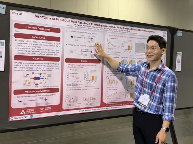 (조세금융신문=송기현 기자) 동아에스티(대표이사 사장 김민영)와 자회사 '뉴로보 파마슈티컬스'는 지난 21일부터 24일까지 미국 올랜도 컨벤션센터에서 개최된 ‘제84회 미국 당뇨병학회(American Diabetes Association, ADA)에서 비만 치료제 ‘DA-1726’의 전임상 연구 결과를 포스터 발표했다고 24일 밝혔다.