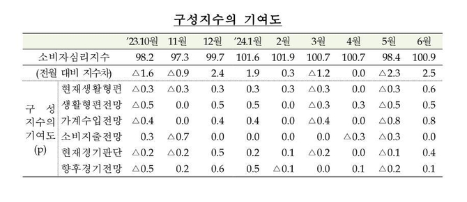 6월 소비자심리지수(CCSI)는 100.9로 전월보다 2.5p 상승했다. CCSI는 지난 1∼4월 내내 100선을 웃돌다가 5월 98.4로 내렸으나, 이달 들어 다시 100선 위로 반등했다.