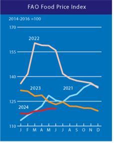 FAO는 곡물·유지류·육류·유제품·설탕 등 5개 품목군별로 식량가격지수를 매월 집계해 발표한다. 지수는 2014∼2016년 평균 가격을 100으로 두고 비교해 나타낸 수치다.