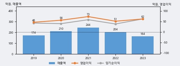일신바이오는 2023년 매출액 164억원과 영업이익 62억원을 기록했다. 전년대비 매출은 -19.5% 하락했고, 영업이익은 20.8% 상승했다. 이 회사의 매출액 증감률과 영업이익 증감률은 각각 코스닥 하위 21%, 상위 30%에 해당된다.