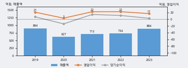 신라에스지의 2023년 매출액은 884억으로 전년대비 20.4% 상승했고, 영업이익은 17억으로 전년대비 -24.9% 하락했다. 이 회사의 매출액 증감률과 영업이익 증감률은 각각 코스닥 상위 21%, 하위 47%에 해당된다.