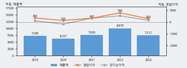 이랜텍은 2023년 매출액 7512억원과 영업이익 304억원을 기록했다. 전년대비 매출은 -24.7%, 영업이익은 -61.8% 각각 하락했다. 이 회사의 매출액 증감률과 영업이익 증감률은 각각 코스닥 하위 15%, 하위 30%에 해당된다.