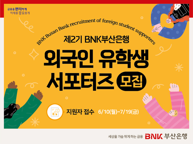 (조세금융신문=구재회 기자) BNK부산은행은 12일 외국인 유학생의 금융 서비스 이용 편의성 강화와 직무 경험 확대를 제공하기 위해 ‘BNK 제2기 외국인 유학생 서포터즈’를 오는 7월 19일(금)까지 모집한다고 밝혔다.