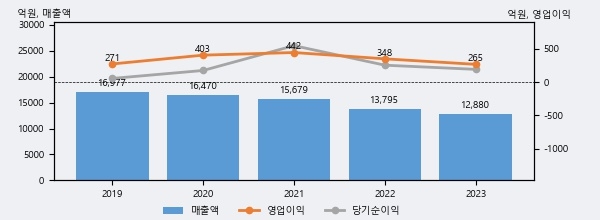 최근 3년간의 실적을 살펴보면, 매출액은 3년 연속 하락하고 있으나 그 하락폭은 줄어들고 있음을 알 수 있다.
